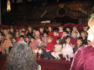 Daisy's preschool had their winter celebration today, which began with a singalong upstairs in the church (the school itself is downstairs). The kids were taught songs in many different languages, reflecting the backgrounds of their teachers: English, Spanish, Italian, Polish, Japanese, Hebrew. Mark accompanied them on guitar for the first song, "All the Colors of Winter." I will post some video when I get a chance, though I warn you the quality is not great. I had to shove my camera between two people's heads and the focus wasn't too good.